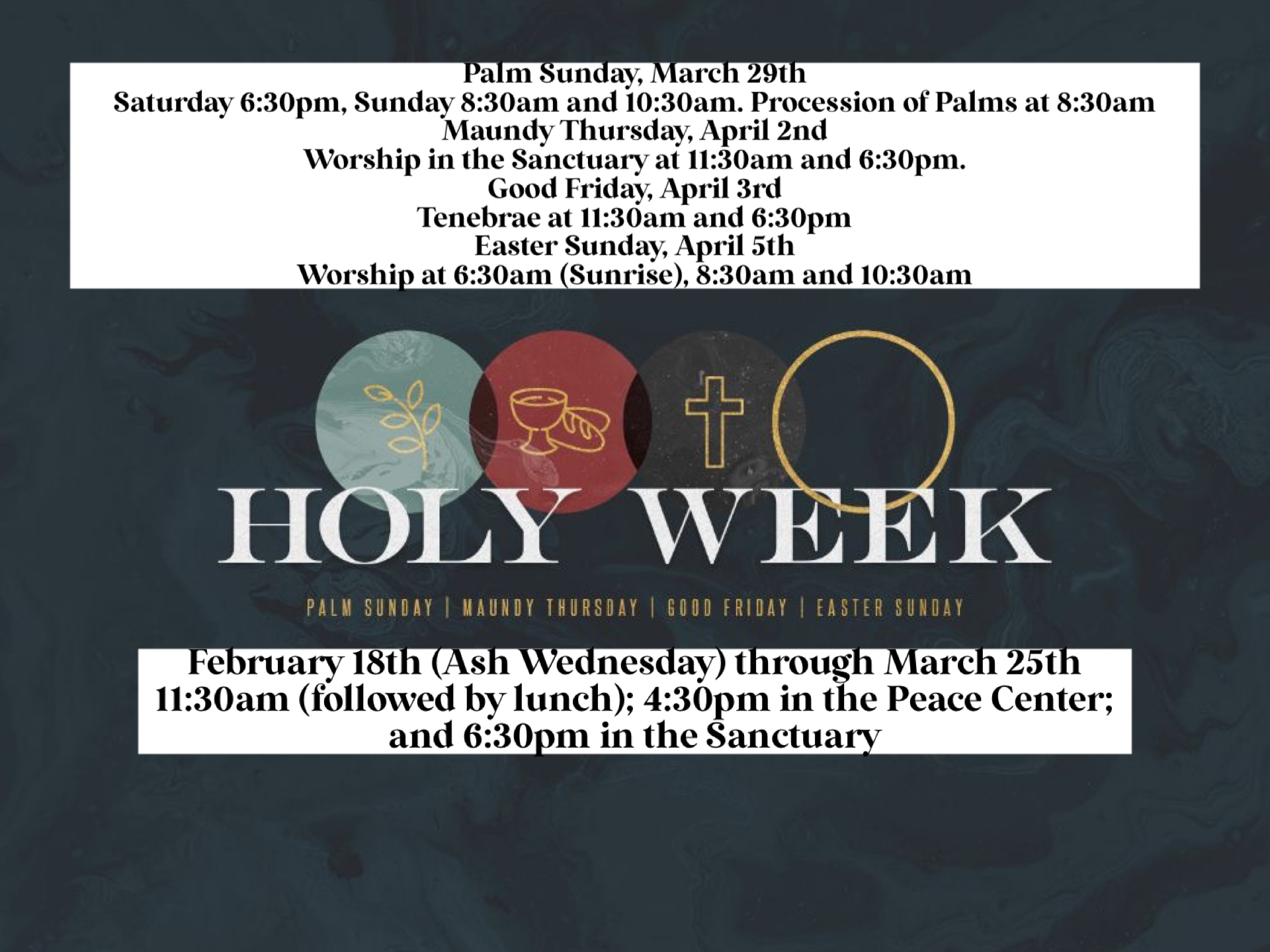 All Evening Programs cancelled..........School out 2 hours early........No Confirmation....No Tiger Tweens....No Handbells........No Youth.....Ash Wednesday Services 11:30 4:30 6:30........Stay warm...Be safe.......