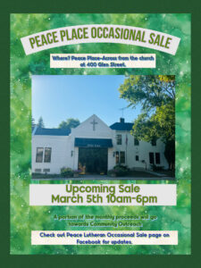 Come and shop at our once a month sale. March 5th will be the next from 10-6. Check out the Peace Lutheran Occasional Sale page on Facebook for all the updates. See you there!!