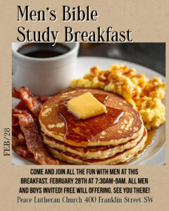 Join us on February 28th at 7:30am in the Peace Center for the Men’s Bible Study Breakfast. Bring a friend and join in on the fellowship.